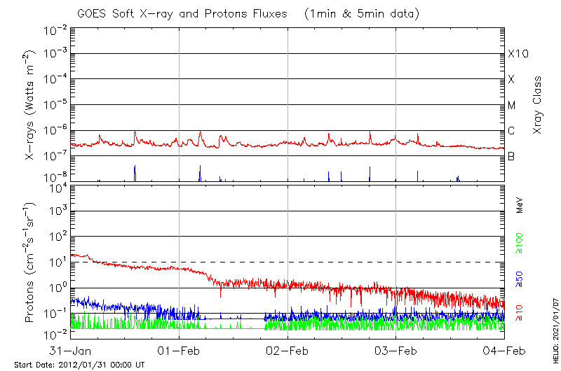 This page provides light-curves generated from GOES soft X-ray and Particle data for the date indicated at the top and the preceding three days.