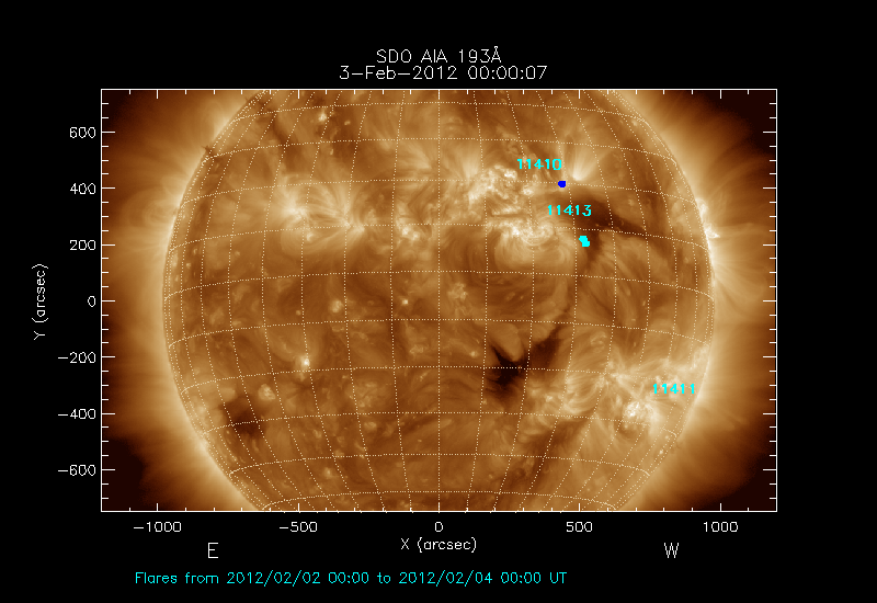 All soft X-ray flares (≥A1.0) where the location has been determined are shown; the flare locations are rotated to the time of the image