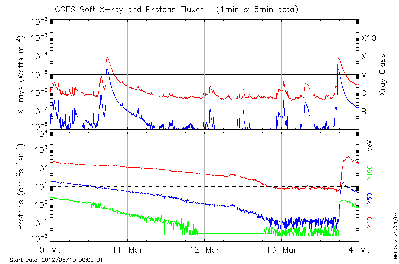 This page provides light-curves generated from GOES soft X-ray and Particle data for the date indicated at the top and the preceding three days.