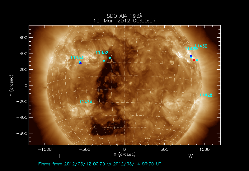 The most recent flares (≤12 hours) are shown as red dots, 12-24 hours ago as blue dots and older ones as turquoise dots.