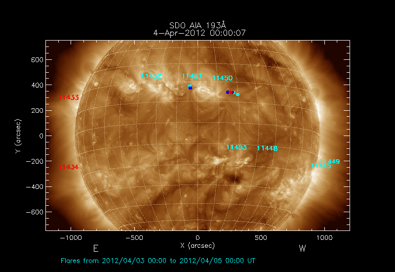 The locations of the flares over-plotted on the image are derived from the flare catalogue