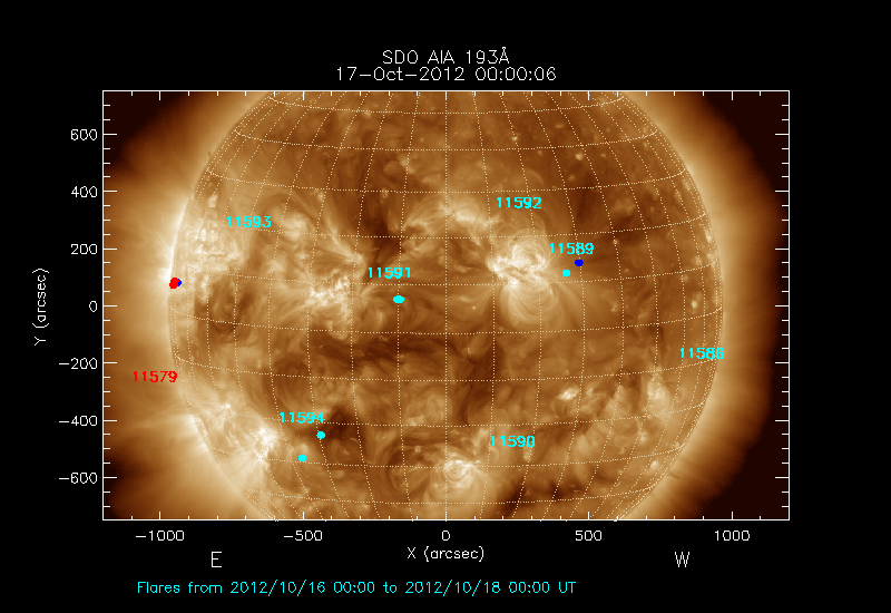 The locations of the flares over-plotted on the image are derived from the flare catalogue prepared by Lockheed Martin (LMSAL, Palo Alto) and included as the gevloc_sxr_flare list in the HELIO HEC: The size of dot indicated the soft X-ray class of the flare – the smallest are C class, medium size are M class and the largest are X class. The colour of the dot gives a rough indication of when the flare occurred, with respect to the time in the bottom left of the image. Red dots are up to 12 hours before the time indicated; blue dots are 12-24 hours; turquoise dots are 24-48 hours.