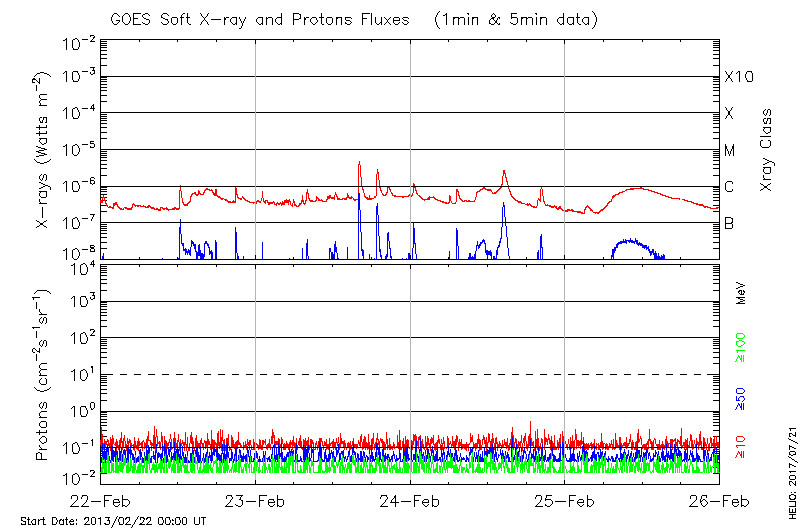 This page provides light-curves generated from GOES soft X-ray and Particle data for the date indicated at the top and the preceding three days.