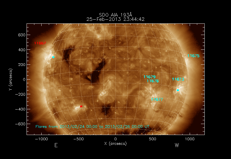 The locations of the flares over-plotted on the image are derived from the flare catalogue