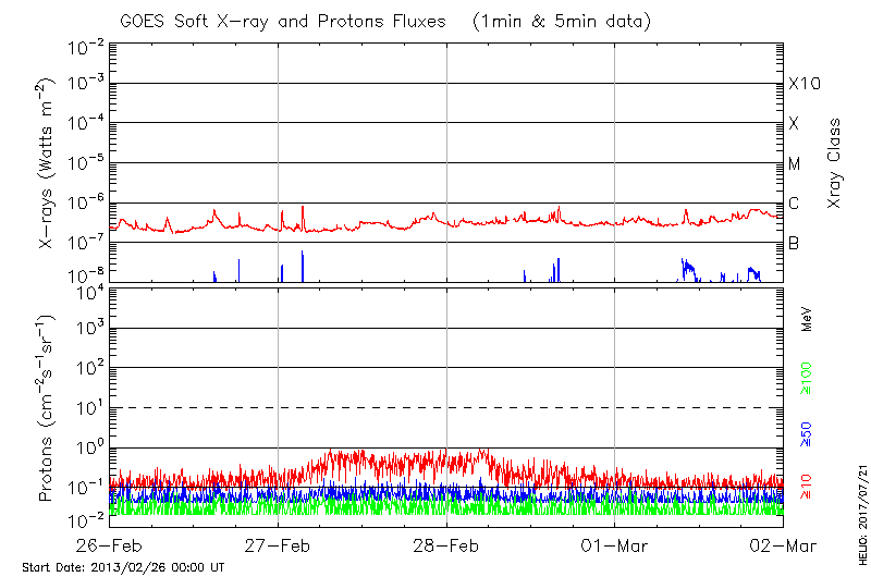 This page provides light-curves generated from GOES soft X-ray and Particle data for the date indicated at the top and the preceding three days.