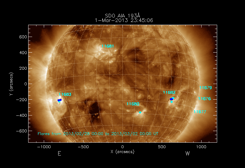 All soft X-ray flares (≥A1.0) where the location has been determined are shown; the flare locations are rotated to the time of the image