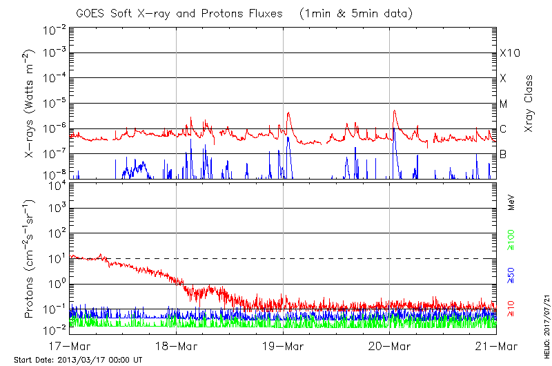 This page provides light-curves generated from GOES soft X-ray and Particle data for the date indicated at the top and the preceding three days.