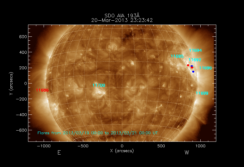 All soft X-ray flares (≥A1.0) where the location has been determined are shown; the flare locations are rotated to the time of the image