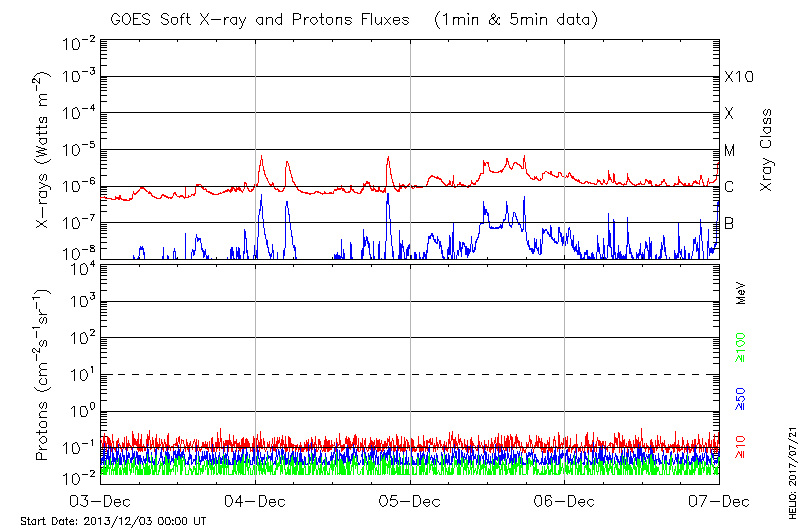 This page provides light-curves generated from GOES soft X-ray and Particle data for the date indicated at the top and the preceding three days.