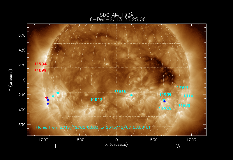 The locations of the flares over-plotted on the image are derived from the flare catalogue