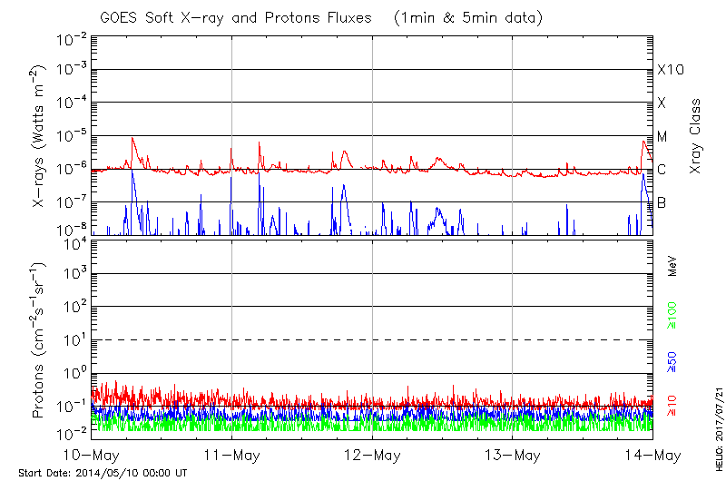 This page provides light-curves generated from GOES soft X-ray and Particle data for the date indicated at the top and the preceding three days.