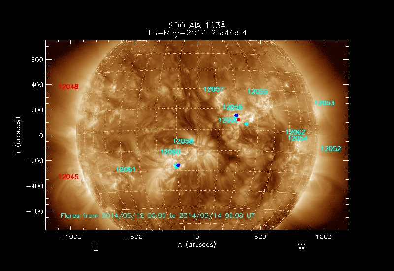 The most recent flares (≤12 hours) are shown as red dots, 12-24 hours ago as blue dots and older ones as turquoise dots.