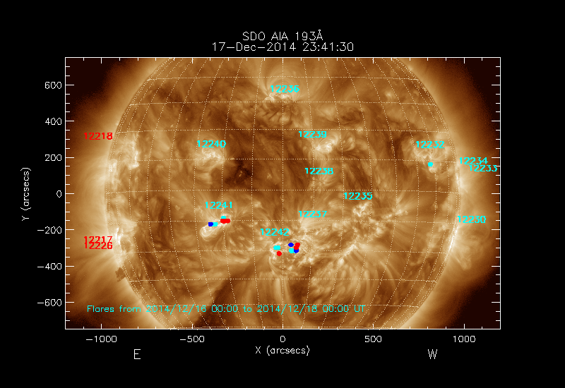 The most recent flares (≤12 hours) are shown as red dots, 12-24 hours ago as blue dots and older ones as turquoise dots.