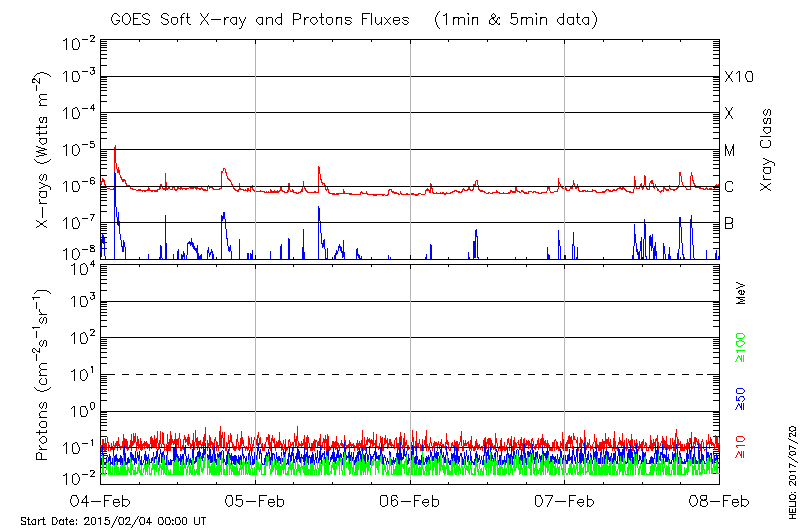 This page provides light-curves generated from GOES soft X-ray and Particle data for the date indicated at the top and the preceding three days.