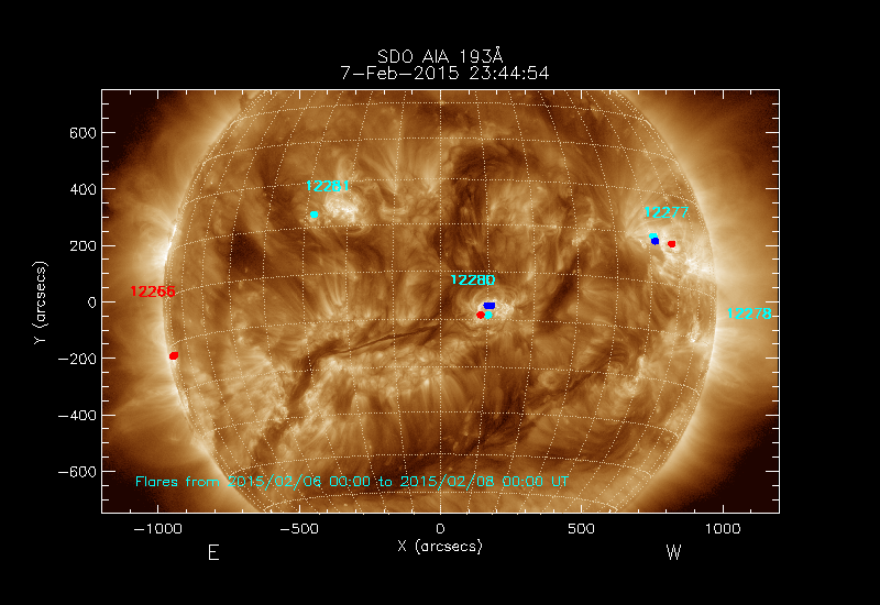 The locations of the flares over-plotted on the image are derived from the flare catalogue