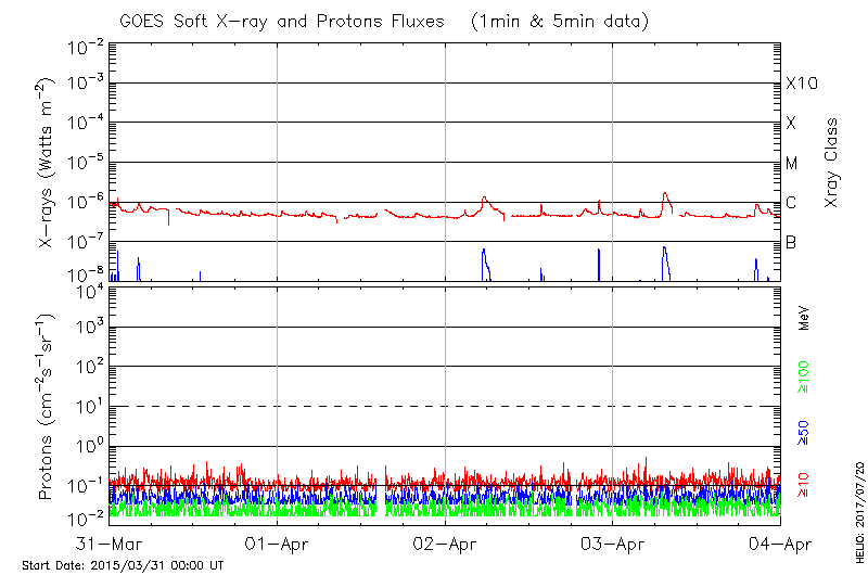 This page provides light-curves generated from GOES soft X-ray and Particle data for the date indicated at the top and the preceding three days.