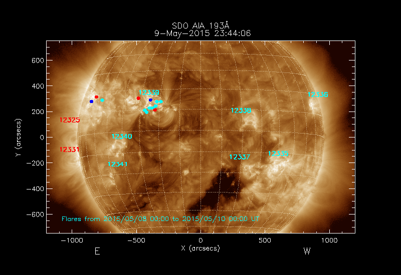 dots and 24-48 hours as turquoise dots; the flare locations are rotated to the time of the image.