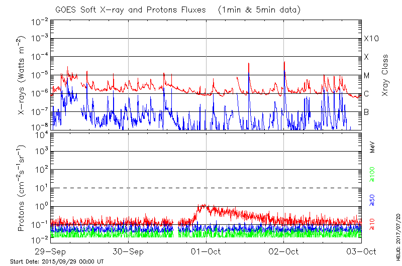 This page provides light-curves generated from GOES soft X-ray and Particle data for the date indicated at the top and the preceding three days.