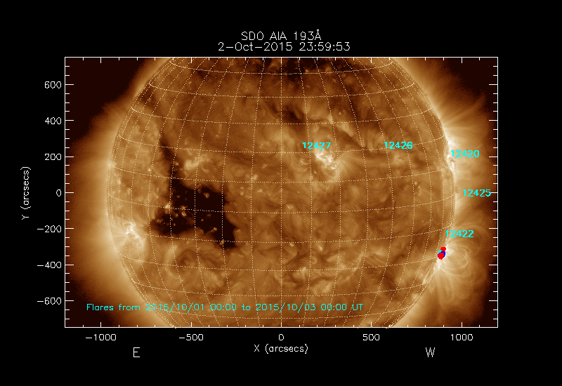 Flares for the 48 hours leading up to the time are over-plotted; these are rotated to the time of the FITS image.