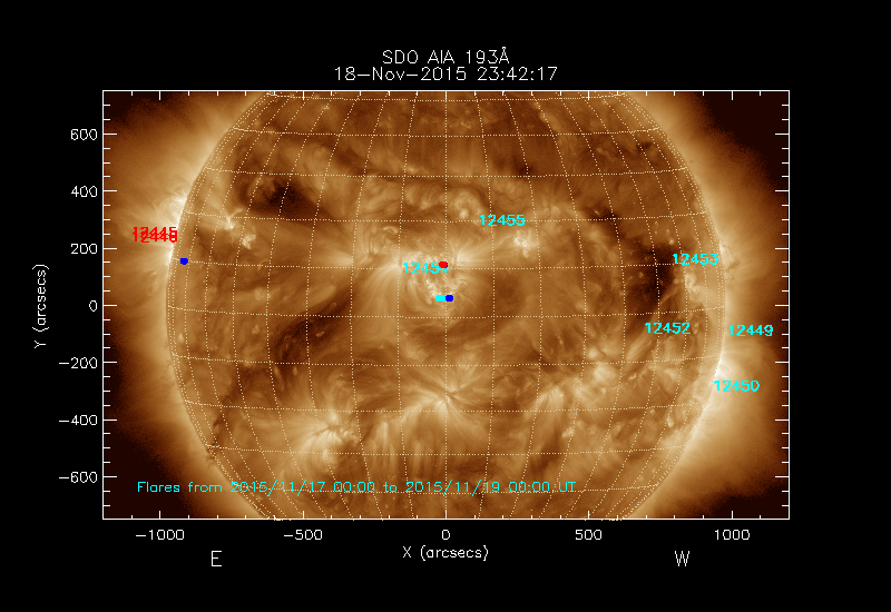 Click on an Active Region plot to display the Region Report including the region evolution and flaring history. HEC Search for NOAA Active Regions (SRS) records for this date and the day before.