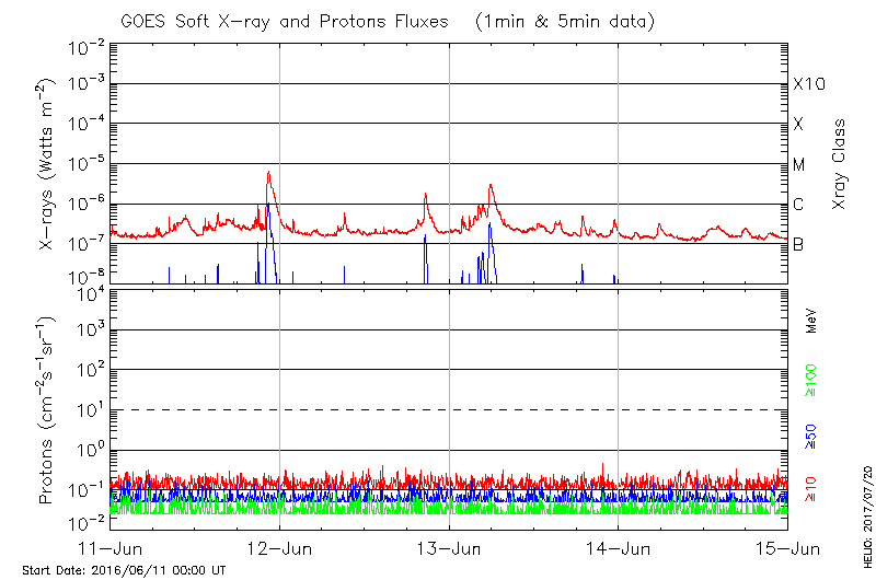 This page provides light-curves generated from GOES soft X-ray and Particle data for the date indicated at the top and the preceding three days.