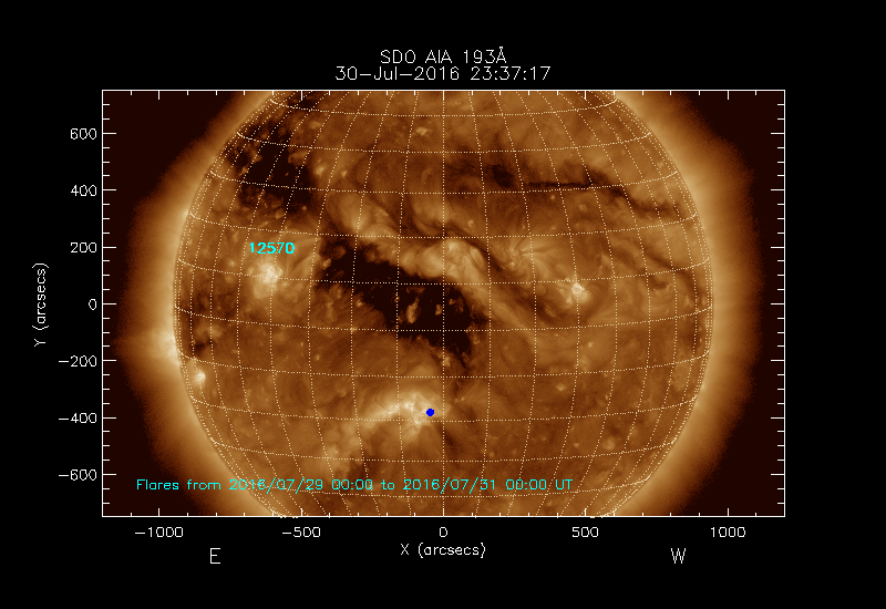 Click on an Active Region plot to display the Region Report including the region evolution and flaring history. HEC Search for NOAA Active Regions (SRS) records for this date and the day before.