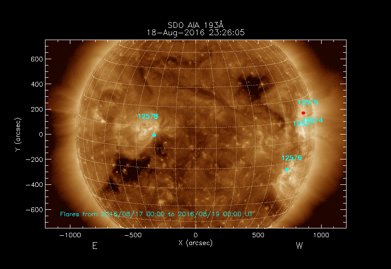 The most recent flares (≤12 hours) are shown as red dots, 12-24 hours ago as blue dots and older ones as turquoise dots.