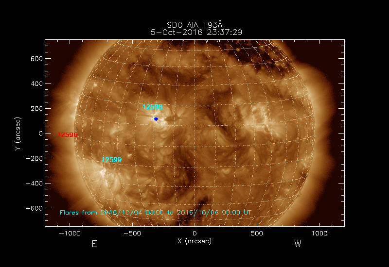 Flares for the 48 hours leading up to the time are over-plotted; these are rotated to the time of the FITS image.