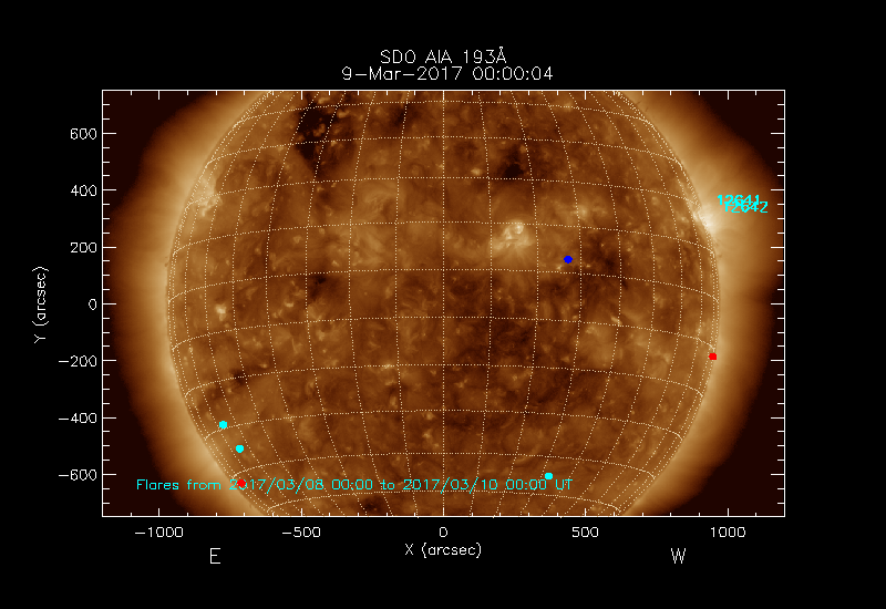• The colour of the dot gives a rough indication of when the flare occurred, with respect to the time in the bottom left of the image. Red dots are up to 12 hours before the time indicated; blue dots are 12-24 hours; turquoise dots are 24-48 hours.