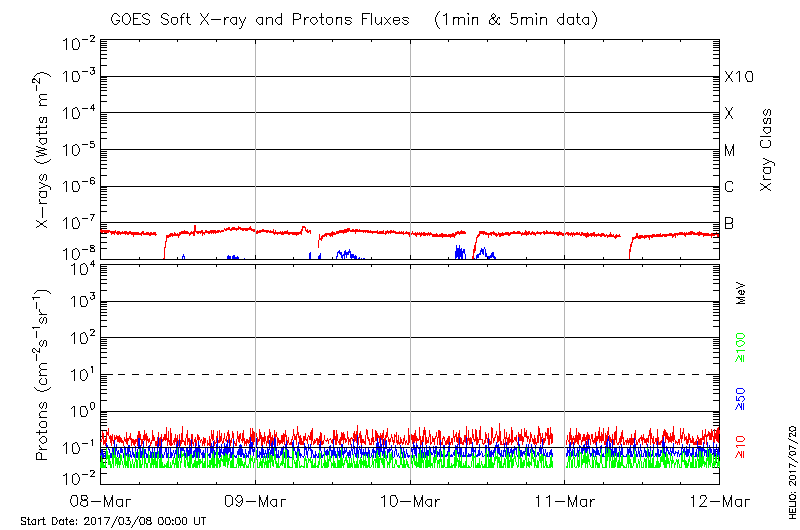 This page provides light-curves generated from GOES soft X-ray and Particle data for the date indicated at the top and the preceding three days.