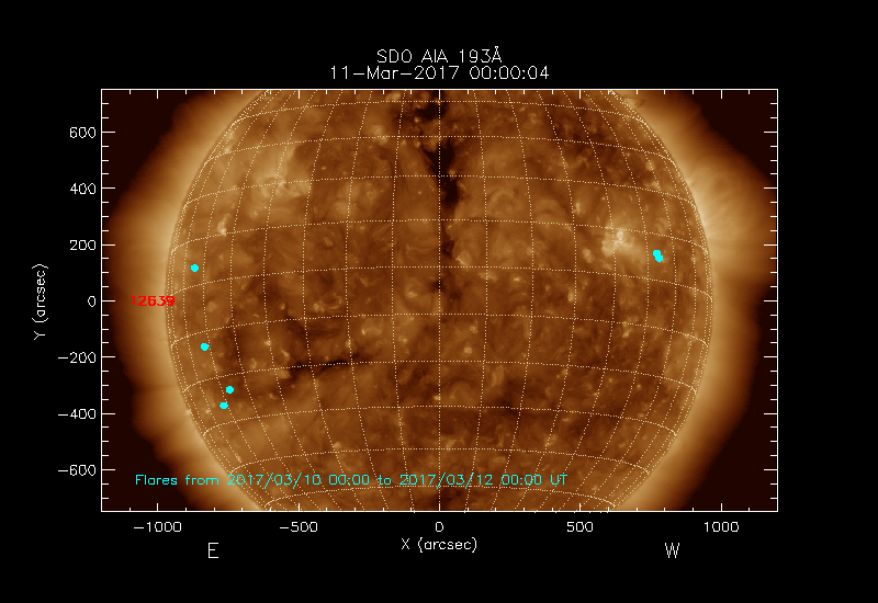 The locations of the flares over-plotted on the image are derived from the flare catalogue