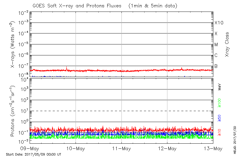 This page provides light-curves generated from GOES soft X-ray and Particle data for the date indicated at the top and the preceding three days.