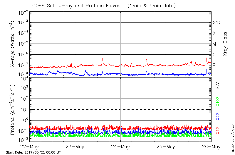 This page provides light-curves generated from GOES soft X-ray and Particle data for the date indicated at the top and the preceding three days.