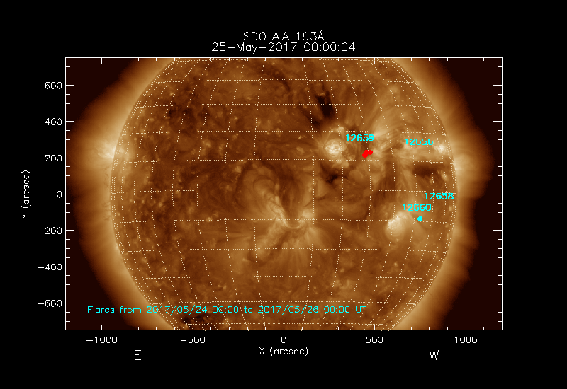 Click on an Active Region plot to display the Region Report including the region evolution and flaring history. HEC Search for NOAA Active Regions (SRS) records for this date and the day before.