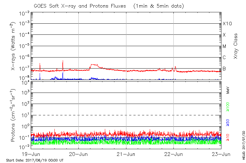 This page provides light-curves generated from GOES soft X-ray and Particle data for the date indicated at the top and the preceding three days.