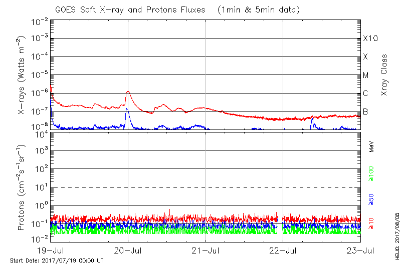This page provides light-curves generated from GOES soft X-ray and Particle data for the date indicated at the top and the preceding three days.