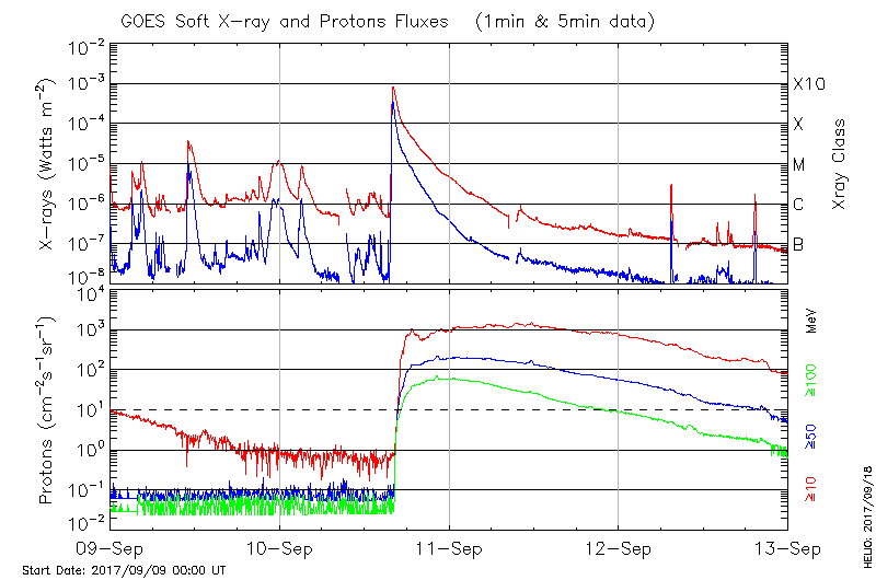 This page provides light-curves generated from GOES soft X-ray and Particle data for the date indicated at the top and the preceding three days.