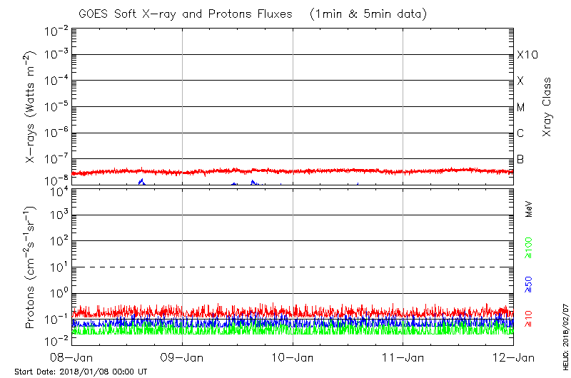 This page provides light-curves generated from GOES soft X-ray and Particle data for the date indicated at the top and the preceding three days.