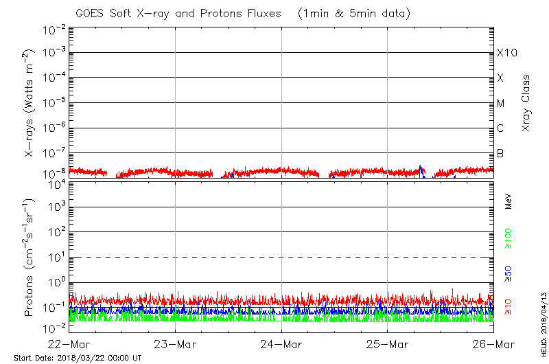 This page provides light-curves generated from GOES soft X-ray and Particle data for the date indicated at the top and the preceding three days.