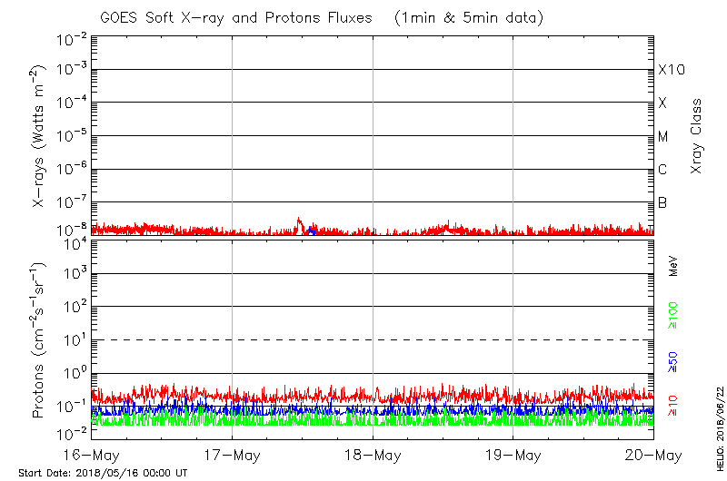 This page provides light-curves generated from GOES soft X-ray and Particle data for the date indicated at the top and the preceding three days.
