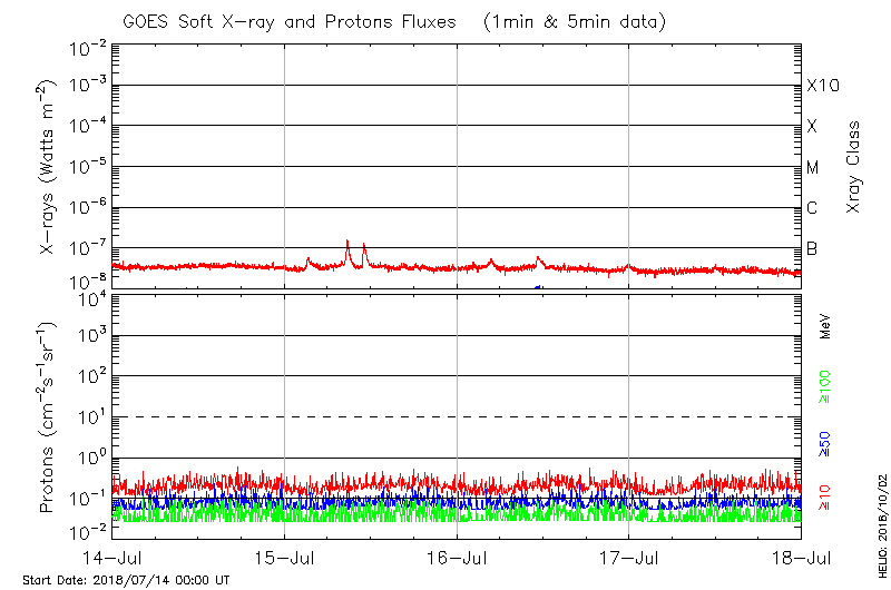 This page provides light-curves generated from GOES soft X-ray and Particle data for the date indicated at the top and the preceding three days.