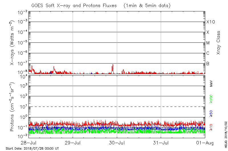 This page provides light-curves generated from GOES soft X-ray and Particle data for the date indicated at the top and the preceding three days.