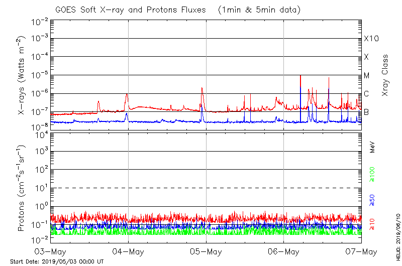 This page provides light-curves generated from GOES soft X-ray and Particle data for the date indicated at the top and the preceding three days.
