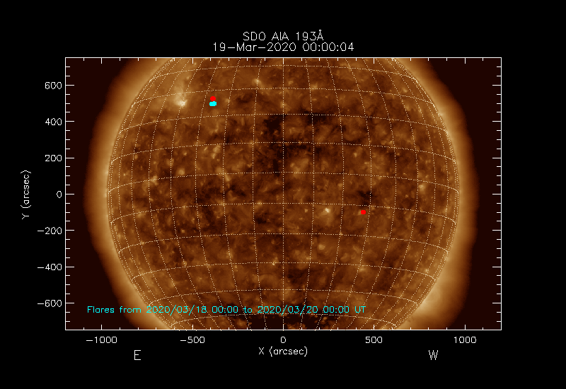 The most recent flares (≤12 hours) are shown as red dots, 12-24 hours ago as blue dots and older ones as turquoise dots.