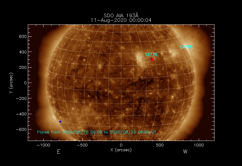The most recent flares (≤12 hours) are shown as red dots, 12-24 hours as blue