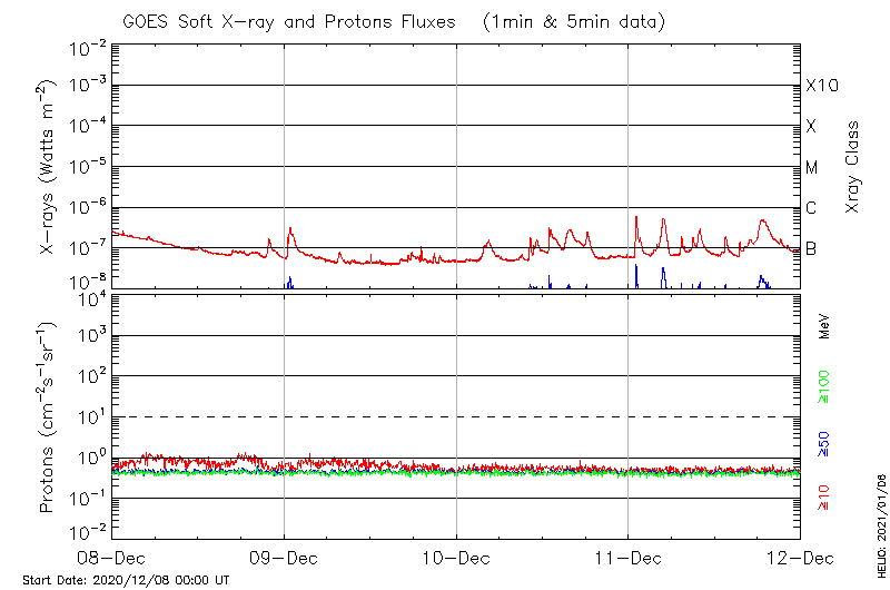 This page provides light-curves generated from GOES soft X-ray and Particle data for the date indicated at the top and the preceding three days.