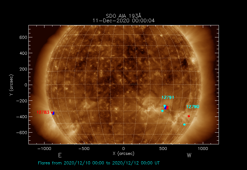 The most recent flares (≤12 hours) are shown as red dots, 12-24 hours ago as blue dots and older ones as turquoise dots.