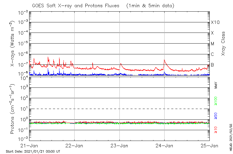 This page provides light-curves generated from GOES soft X-ray and Particle data for the date indicated at the top and the preceding three days.