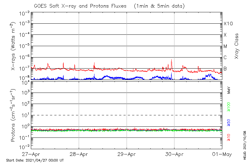 This page provides light-curves generated from GOES soft X-ray and Particle data for the date indicated at the top and the preceding three days.