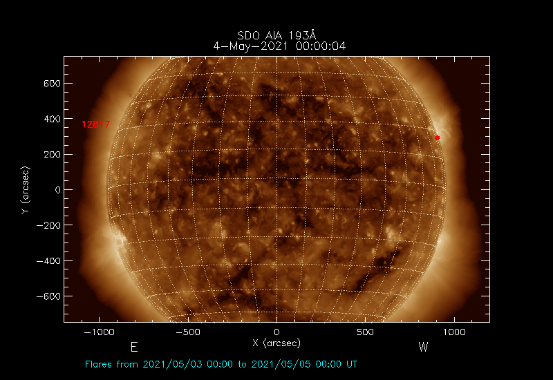 Click on an Active Region plot to display the Region Report including the region evolution and flaring history. HEC Search for NOAA Active Regions (SRS) records for this date and the day before.
